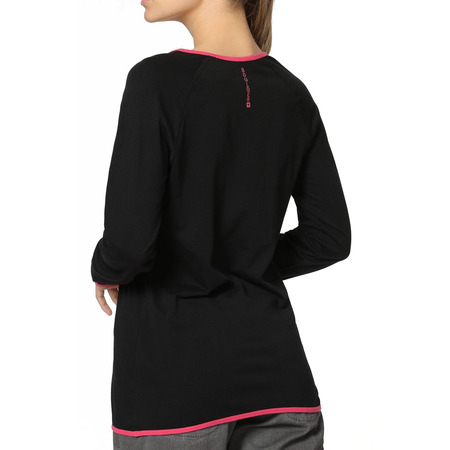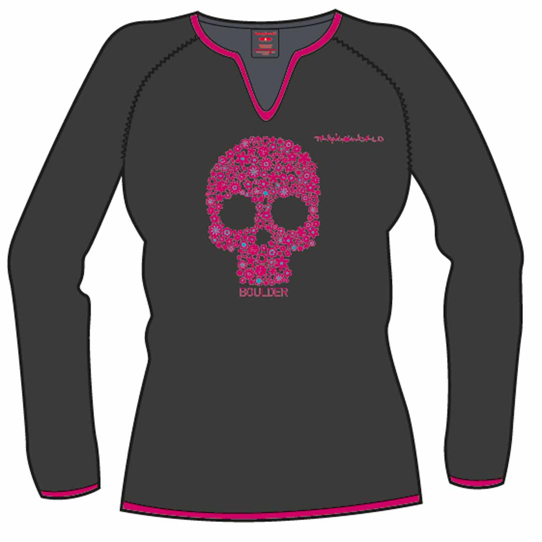 Camiseta de mujer en tejido de Algodón con Costuras Flatlock (4 agujas), cuello redondo y pico, manga larga y serigrafía. Transpirable, tejido natural, tratamiento antipilling, lavado siliconado. Suave, higiénica y fácil de mantener.