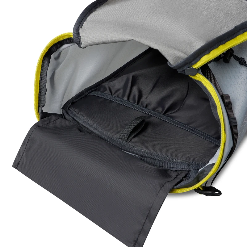- Bolsillos laterales con panel de malla elástica, ideal para botellas, cantimploras, barritas de trekking y geles energéticos
