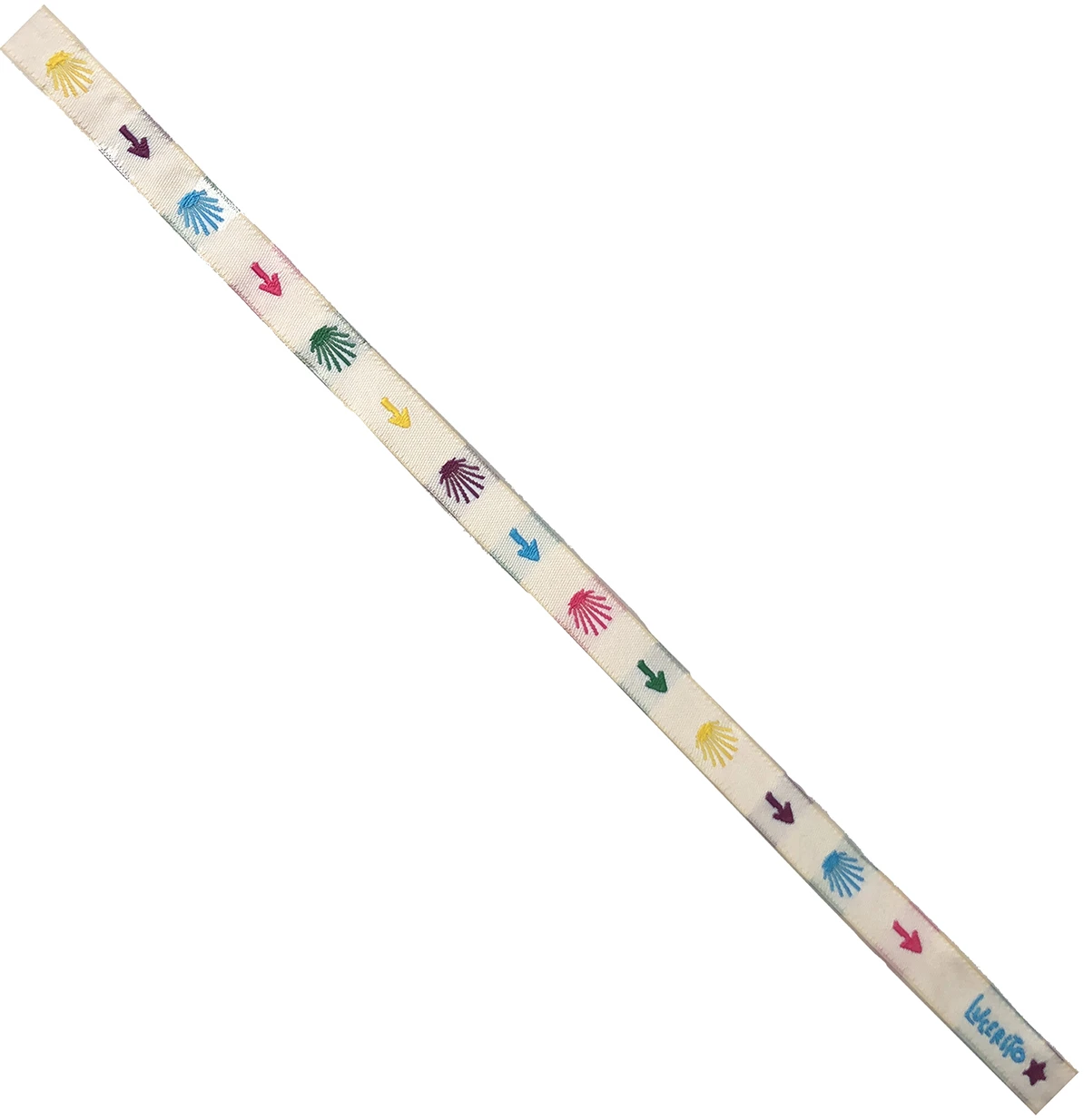Pulsera de tela blanca con flechas y estrellas de colores.