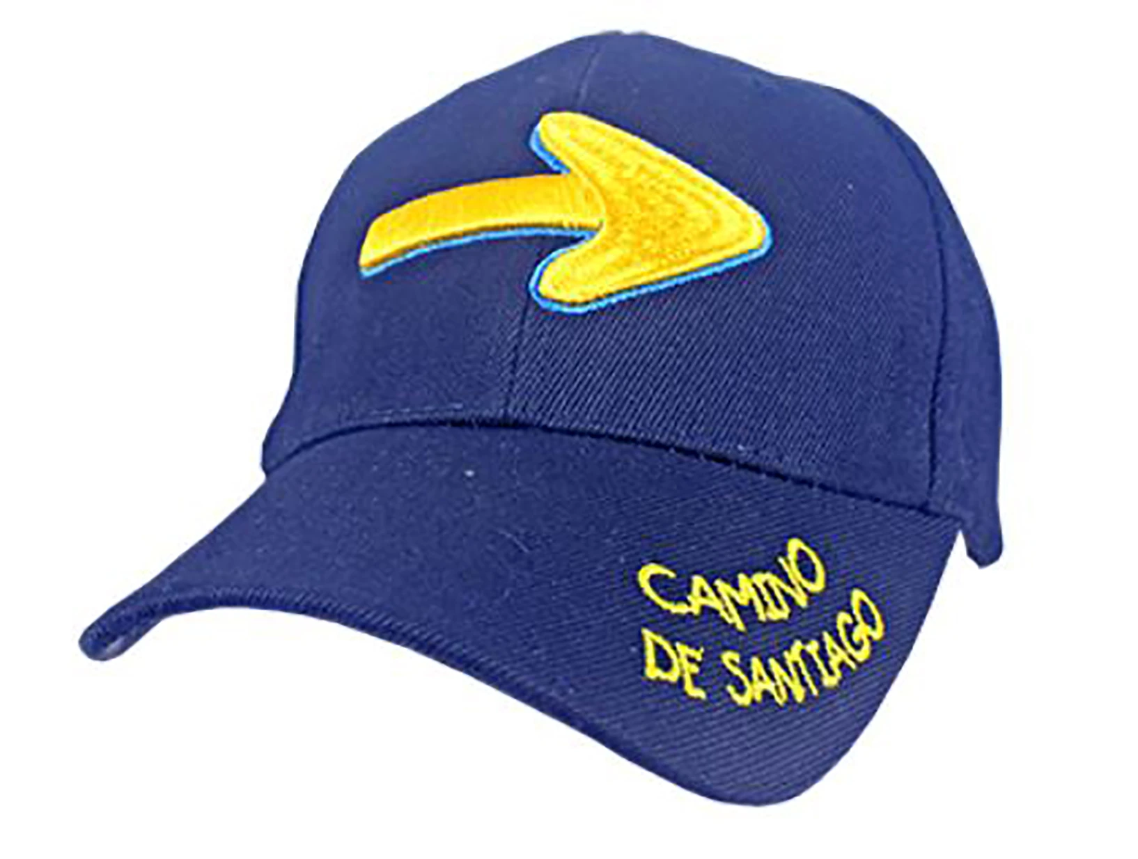 Visera del Camino de Santiago con bordado de flecha amarilla y el texto Camino de Santiago. Ajustable en la parte trasera.